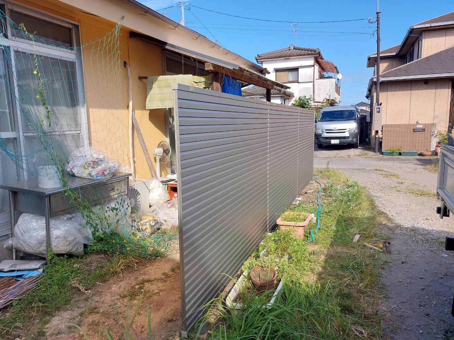 その他工事 鹿児島市F様邸 After Before 作業・施工内容 台風10号にて木製フェンスが壊れたとご依頼いただき、アルミ製のフェンスへ交換しました。 仕様 木製フェンス→アルミフェンス(YKKシンプレオフェンス) 材料 フェンス基礎ブロック 自由柱T160 YL1型本体 エンドキャップ 目隠しコーナー継手